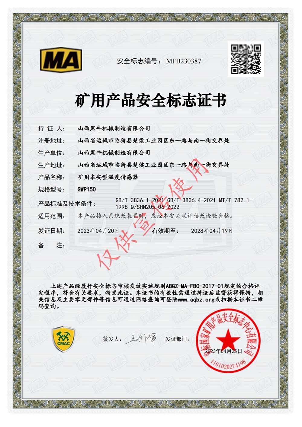 礦用本安型溫度傳感器安標(biāo)證