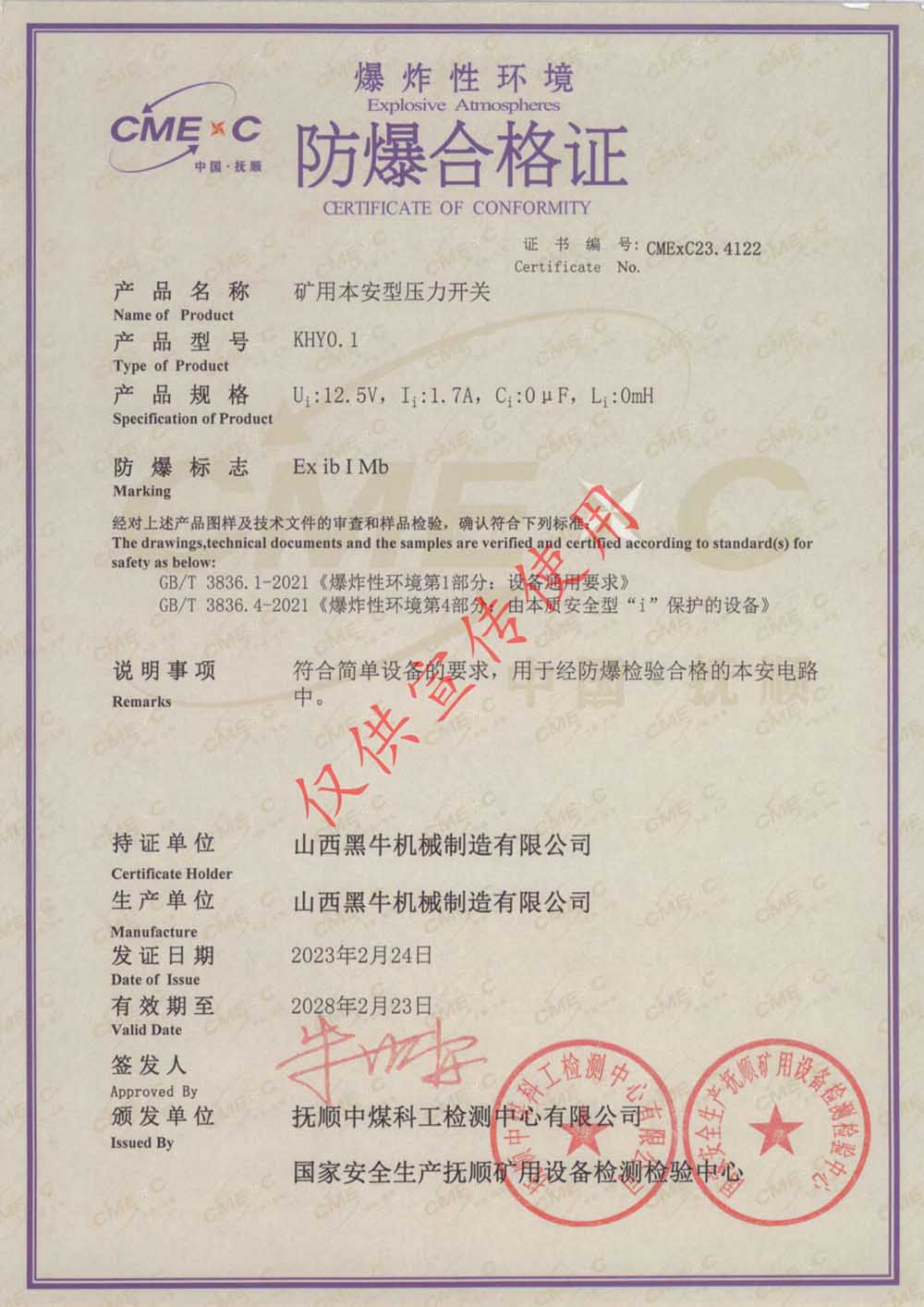 礦用本安型壓力開(kāi)關(guān)合格證